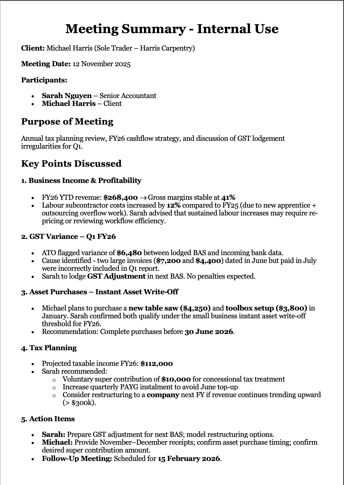A polished, internal-use summary for accountants and advisory teams. Created in either concise or in-depth format, this document clearly outlines key discussion points, who raised them, and when, making it simple for any staff member to step in, assist a client, or continue the workflow without confusion.