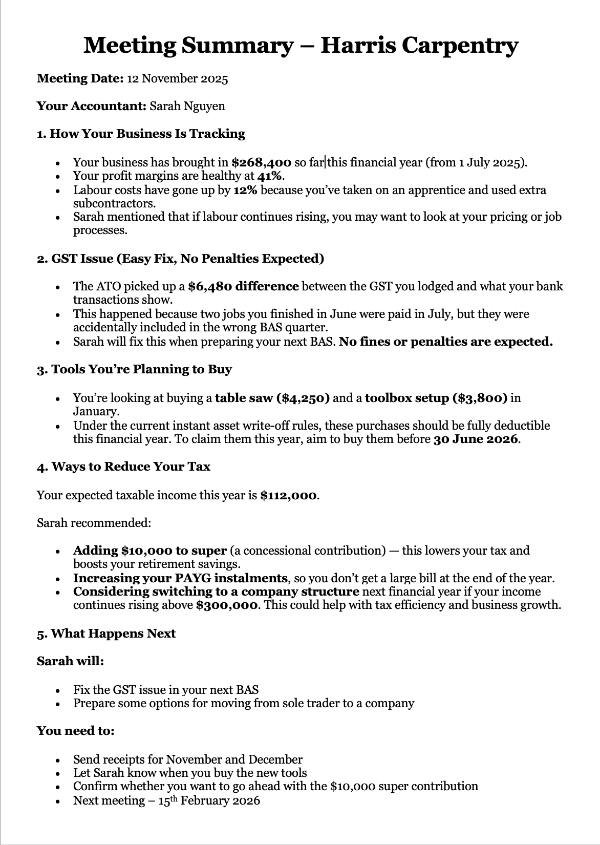 A clear, easy-to-understand document written in everyday language for your clients. This version removes accounting jargon and explains what was discussed, what it means, and what actions they need to take. It can be as concise or as detailed as required, helping clients feel informed while reducing follow-up questions for your team.